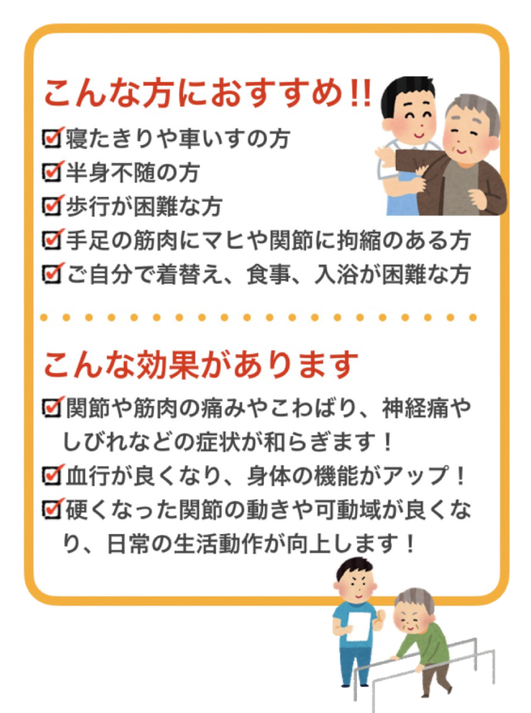 ご自宅で鍼灸やマッサージの施術、運動などのリハビリが受けられます!