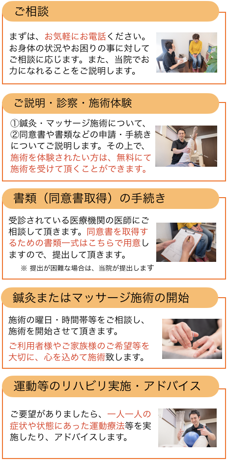 当院では、ご利用の患者様やご家族様から丁寧にお話をお伺いし、その方に適した鍼灸施術やマッサージ施術、機能訓練や運動療法等を行っております。